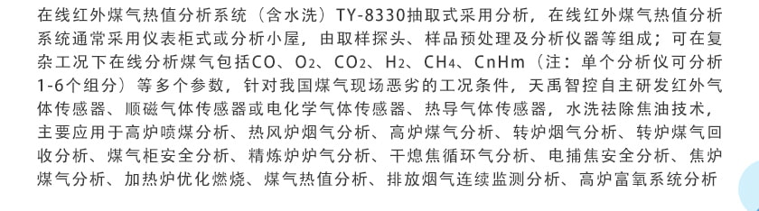 在線紅外煤氣熱值儀TY-6330采用國際先進(jìn)的NDIR非分光紅外技術(shù)和基于MEMS的TCD熱導(dǎo)技術(shù),主要用于測量各種煤氣、生物燃?xì)庵械腃O、CO2、CH4、H2、O2、CnHm?等六種氣體體積濃度及熱值。