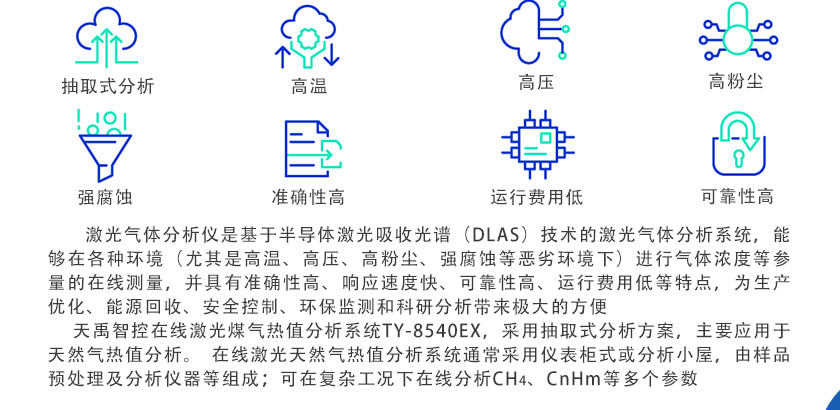 在線激光氣體分析儀TY-6500采用國際最先進的TDLAS激光技術,主要用于測量各種氣體中的HF、HCL、O2、CO、CO2、H2O、O2、NH3、CH4?等氣體體積濃度及熱值。