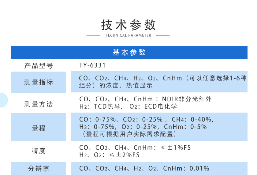 CO、CO2、CH4、CnHm :NDIR非分光紅外; H2:TCD熱導, O2:ECD電化學 |