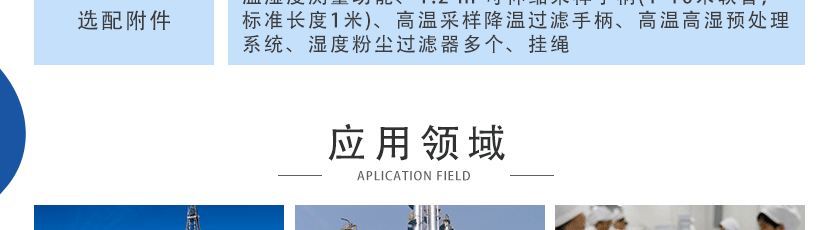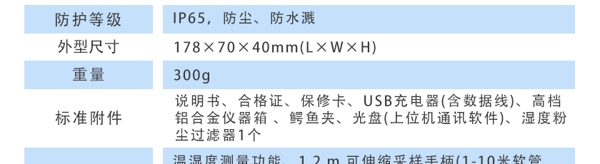 溫濕度測量功能、1.2 m 可伸縮采樣手柄(1-10米軟管,標(biāo)準(zhǔn)長度1米)、高溫采樣降溫過濾手柄、高溫高濕預(yù)處理系統(tǒng)、濕度粉塵過濾器多個、掛繩 |