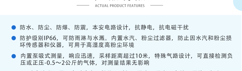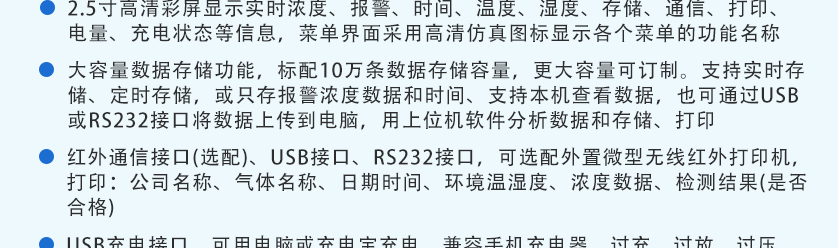 內置微型采樣的泵吸式便攜式氣體檢測儀;儀器可通過USB數據接口與電腦相連,下載打印數據,大屏幕液晶點陣顯示技術,中文操作界面方便的數據直讀功能。殼體采用阻燃ABS塑膠材料,手感舒適,傳感檢測元件采用進口傳感器,檢測數據穩定可靠,儀表廣泛使用于易燃易爆、需要防中毒,防窒息的檢測場所。