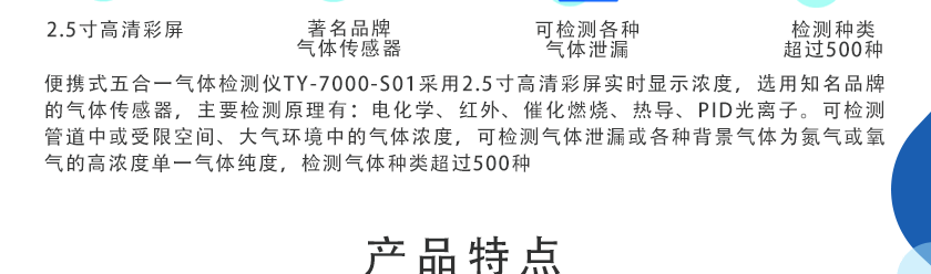 采用2.31寸高清彩屏實時顯示濃度,選用知名品牌的氣體傳感器,主要檢測原理有:電化學、紅外、催化燃燒、熱導、PID光離子。可檢測管道中或受限空間、大氣環境中的氣體濃度,可檢測氣體泄漏或各種背景氣體為氮氣或氧氣的高濃度單一氣體純度,檢測氣體種類超過500種。