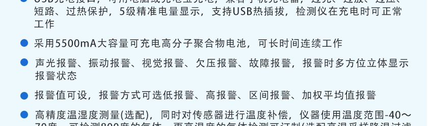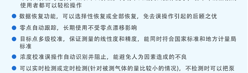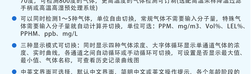 CO(0.1ppm)、H2S(0.01ppm)、O2(0.01%Vol)、Ex(0.1%LEL)、CO2(1ppm)、NOX(0.1ppm),分辨率可訂制 |