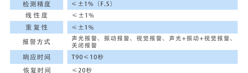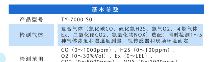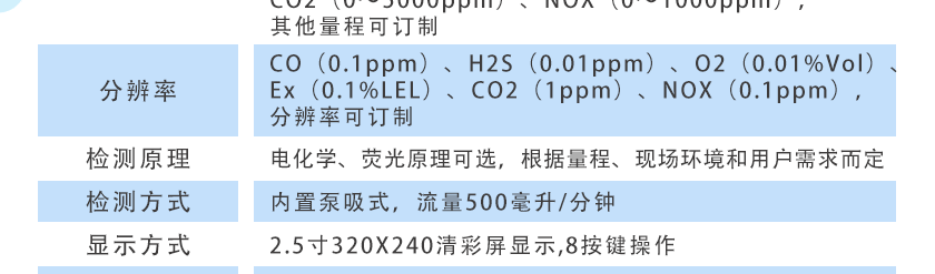 CO(0~1000ppm)、H2S(0~100ppm)、O2(0~30%Vol)、Ex(0~LEL)、CO2(0~5000ppm)、NOX(0~1000ppm),其他量程可訂制 |