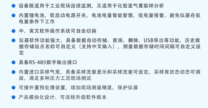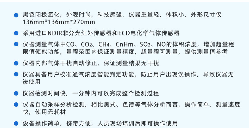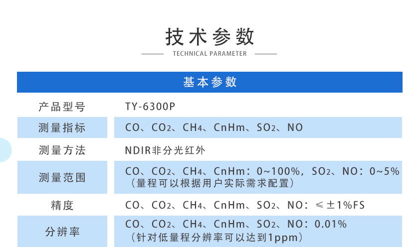 CO、CO2、CH4、CnHm、SO2、NO:0.01%(針對低量程分辨率可以達到1ppm) |