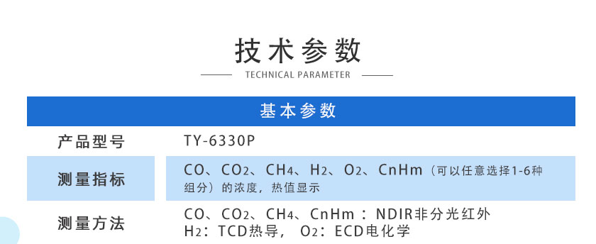 • 在線紅外氣體分析儀 TY-6300 在線紅外氣體分析儀TY-6300采用自主知識產權的NDIR非分光紅外技術,主要用于測量CO、CO2、CH4、C3H8、SO2、NO等氣體的體積濃度及熱值。適用于鋼鐵、化工、煤氣化、生物氣化、節能監測、能效測評等領域,測量焦爐煤氣、高爐煤氣、轉爐煤氣、混合煤氣、發生爐煤氣、生物燃氣等可燃氣體不同成分的體積濃度和熱值。