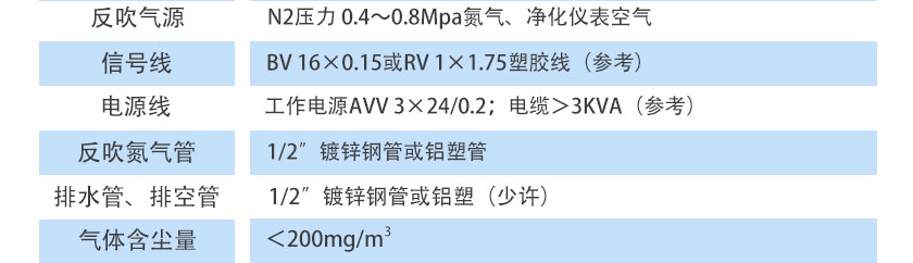 N2壓力 0.4~0.8Mpa氮氣、凈化儀表空氣 |