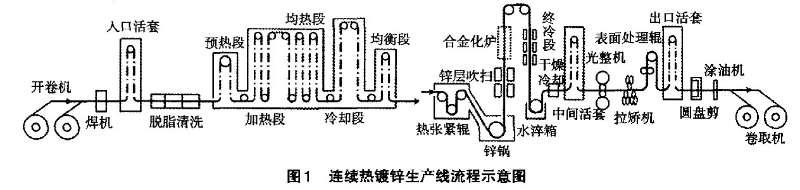 開卷→焊接→脫脂清洗→退火爐→(預(yù)熱→加熱→均熱→冷卻→均衡)→熱浸鍍鋅→(合金化爐)→鍍后冷卻→光整→拉矯→表面處理(鈍化/耐指紋)→切邊→在線質(zhì)量檢測(cè)→涂油→卷取。其流程示意圖如圖1所示。