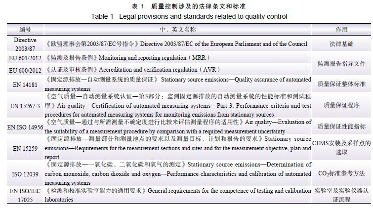 為保證EU ETS 的正式運行,歐盟形成了一套“指令–規(guī)范–標準”的系統(tǒng)性管理模式。2003 年頒布的《2003/87 號指令》(Directive 2003/87)對溫室氣體進行全面管理,該指令包括監(jiān)測方法的說明、質(zhì)量控制總體原則。在總體原則基礎上,制定了專門的指南、條例,具體指導CO2 監(jiān)測質(zhì)量保證的實施。質(zhì)量保證體系的所有環(huán)節(jié)使用的方法統(tǒng)一依據(jù)歐盟標準、國際標準化組織(ISO)標準和行業(yè)最佳實用導則。整個過程中涉及的法律法規(guī)和標準見表1。