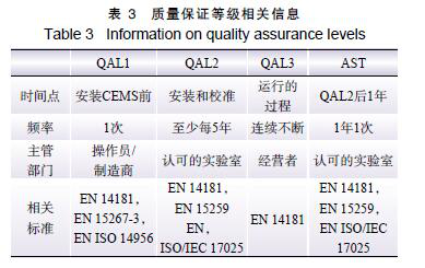 歐盟的質(zhì)量控制共包含3 個質(zhì)量保證級別(quality assurance levels,QAL)和1 個年度監(jiān)視測試(annual surveillance test,AST),從儀器的安裝到年度的檢測, 歐盟對數(shù)據(jù)進行持續(xù)性把控,確保數(shù)據(jù)質(zhì)量始終處于規(guī)定的不確定度范圍內(nèi), 及時調(diào)整儀器, 減少系統(tǒng)誤差。各質(zhì)量保證級別測試時間、頻率、主管部門和相關(guān)標準見表3。