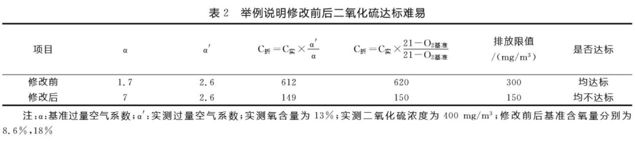 從以上對照表(表1)可以看出,修改單將基準(zhǔn)含氧量更改為18%,這樣更切合隧道窯工藝實(shí)際情況,關(guān)鍵點(diǎn)就在這里,因磚瓦窯含氧量一般在17%~20%。二氧化硫的排放限值由300 mg/m3調(diào)整為150 mg/m3,看似更加嚴(yán)厲,其實(shí)較之前更容易達(dá)標(biāo)。例如某隧道窯實(shí)測含氧量為13%,二氧化硫?qū)崪y濃度為 400 mg/m2,按照修改前后計(jì)算是否達(dá)標(biāo),見表2。