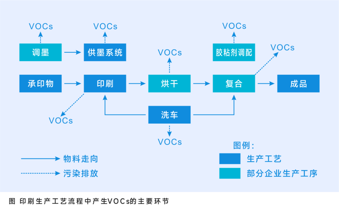 印刷工藝中,VOCs來源于所使用的油墨及稀釋劑(印刷不透氣承印物需添加稀釋劑,如金屬印刷、塑料印刷)、復合用膠粘劑(僅限于部分存在復合工藝的印刷企業)及設備清洗劑,可能的排放途徑有油墨調配過程溶劑揮發、印刷過程油墨溶劑揮發、烘干階段、復合過程及設備清洗過程等。