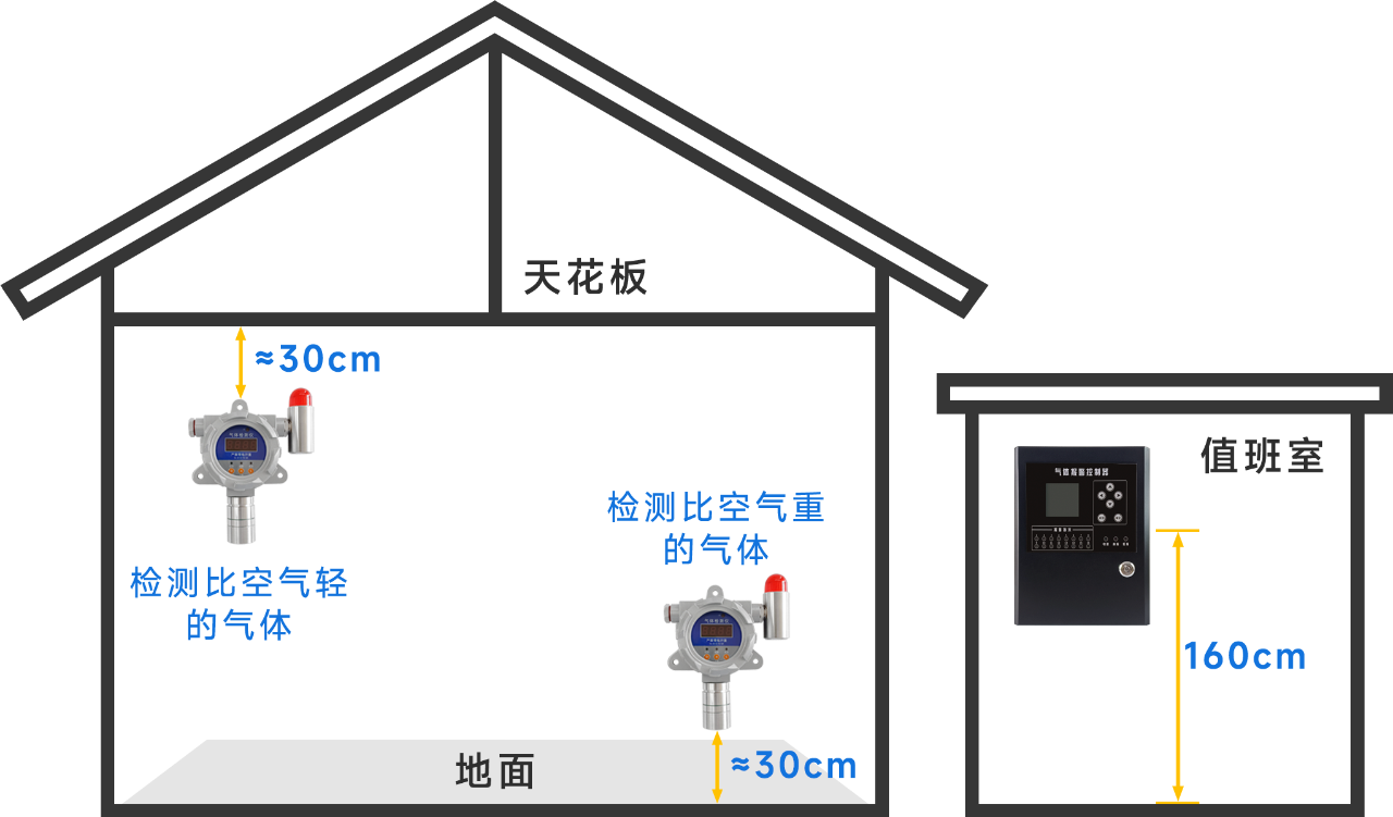 2.檢測(cè)可燃?xì)怏w比重小于空氣時(shí),可燃?xì)怏w檢測(cè)儀安裝位置應(yīng)該在疑似泄漏點(diǎn)上方,距離天花板不大于30-60cm,檢測(cè)可燃?xì)怏w比重大于空氣時(shí),可燃?xì)怏w檢測(cè)儀安裝位置應(yīng)該在疑似泄漏點(diǎn)下方30-60cm,距離地面不大于30cm;