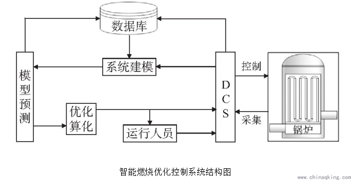 鍋爐智能燃燒優(yōu)化的實(shí)質(zhì)是通過(guò)先進(jìn)檢測(cè)裝置檢測(cè)鍋爐各關(guān)鍵運(yùn)行參數(shù)并對(duì)這些參數(shù)進(jìn)行實(shí)時(shí)分析處理,然后采用AI優(yōu)化控制算法在線(xiàn)調(diào)整鍋爐運(yùn)行參數(shù),使鍋爐燃燒的各類(lèi)運(yùn)行參數(shù)處于最佳狀態(tài)。智能燃燒優(yōu)化系統(tǒng)一般為基于電廠(chǎng)現(xiàn)有DCS控制系統(tǒng)的控制系統(tǒng),無(wú)需對(duì)鍋爐進(jìn)行改造,投資少、風(fēng)險(xiǎn)小且優(yōu)化效果顯著。如圖1所示為智能燃燒優(yōu)化控制系統(tǒng)結(jié)構(gòu)圖,系統(tǒng)分為開(kāi)環(huán)操作指導(dǎo)和閉環(huán)監(jiān)控兩種優(yōu)化方式,開(kāi)環(huán)方式為智能優(yōu)化系統(tǒng)將各被控量的調(diào)節(jié)值提交給運(yùn)行人員,由運(yùn)行人員手動(dòng)對(duì)DCS系統(tǒng)進(jìn)行調(diào)節(jié);閉環(huán)方式為智能優(yōu)化系統(tǒng)將各被控量的調(diào)節(jié)指令直接上傳至DCS系統(tǒng)中,自動(dòng)完成優(yōu)化調(diào)節(jié)。