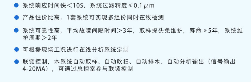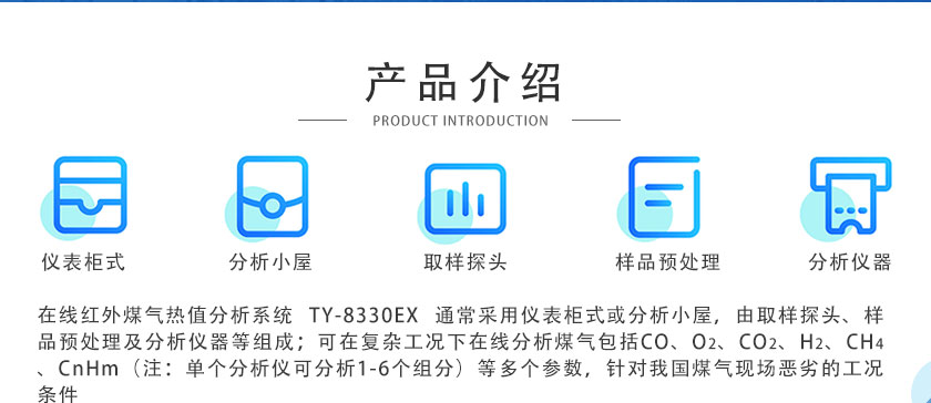 TY-8300型煤氣在線分析系統(tǒng)是天禹智控自主研發(fā)新型在線監(jiān)測系統(tǒng),該產(chǎn)品基于非分光紅外(NDIR)氣體分析技術、長壽命電化學傳感技術以及基于MEMS的熱導技術,可同時在線測量煤氣的熱值,以及CO、CO2、CH4、H2、O2、CnHm等氣體的體積濃度。預處理系統(tǒng)采用冷干法設計,關鍵部件采用原裝進口,可根據(jù)現(xiàn)場不同的工況條件,為客戶定制解決方案,保證分析系統(tǒng)的可靠運行。